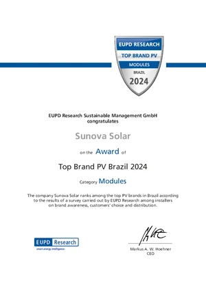 EUPD Research,被誉为光伏行业的“风向标”,每年通过深入的民意调查和数据模型分析,从客户对产品质量、产品销售力度和品牌满意度等多个指标对全球光伏产业的安装商和分销商进行严格评选。云程光伏荣幸地获得了2024年巴西区域EUPD的顶级光伏品牌奖(Top Brand PV),这是对我们品牌、产品及服务全面认可的象征。