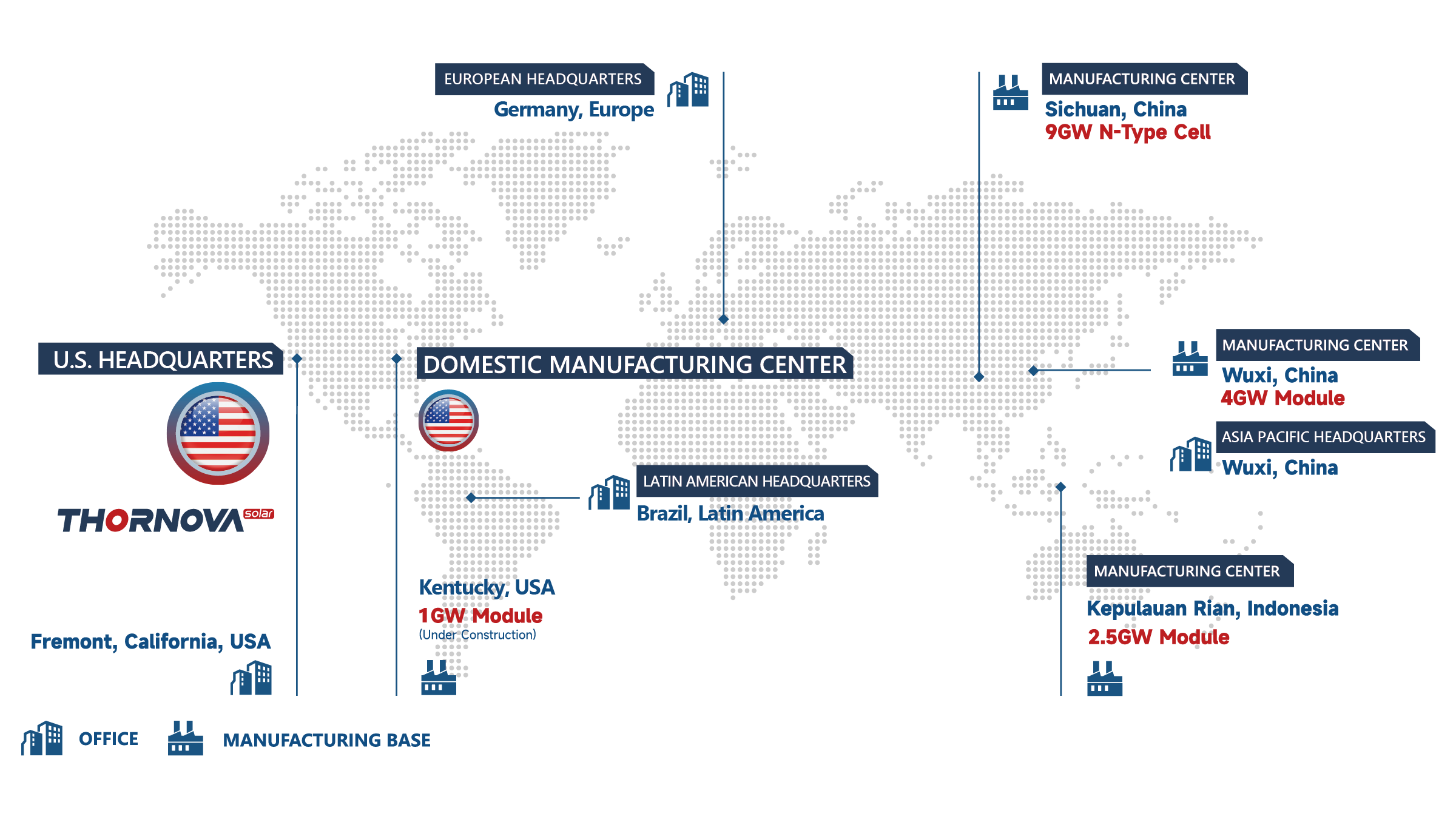 As a company operating on a worldwide scale, Thornova Solar provides vast experience and local service to our customers. Our main headquarters are in China, while our regional head offices are located in Frankfurt, Germany (Europe) San Francisco (USA) and Sao Paulo (Brazil). We keep product stock in our warehouses in São Paulo (Brazil), Rotterdam (Netherlands), and at 3 locations (New York, Long beach and Houston) in the USA.