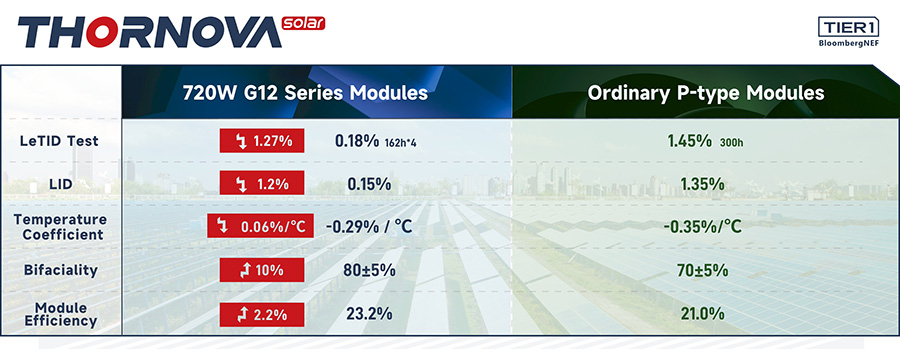 Furthermore, Thornova's hydrogen passivation technology ensures exceptional LeTID attenuation performance. The 720W modules demonstrate an attenuation of less than 0.18% after 162h * 4 testing, outperforming PERC modules that exhibit attenuation of less than 1.45% after 300h testing. Because of these advantages and the larger wafer size, Thornova’s G12 modules reduce balance of system (BOS) costs by 6.1% and increase power generation by 4.2%, when compared with conventional PERC modules.
