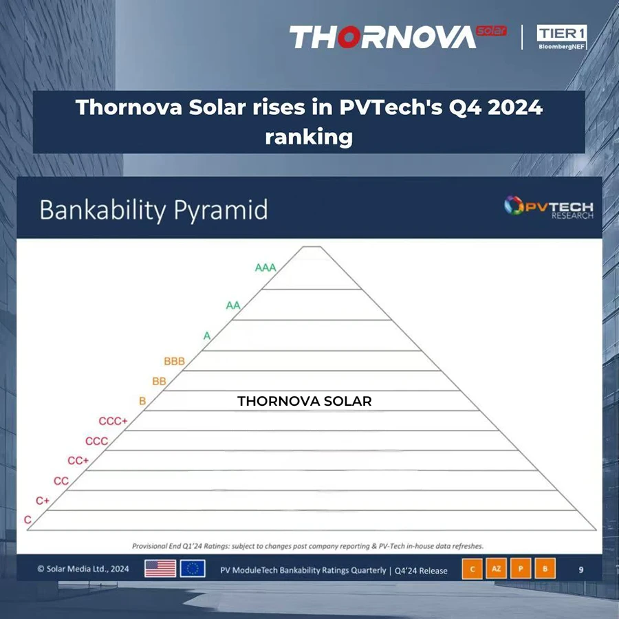 Thornova Solar is delighted to announce that is has achieved B ranking in the Q4 2024 PV Tech Bankability report. This development further underlines Thornova Solar’s ongoing and successful efforts to take a financially healthy approach to growth making it a trustworthy partner to its customers and their investors alike.